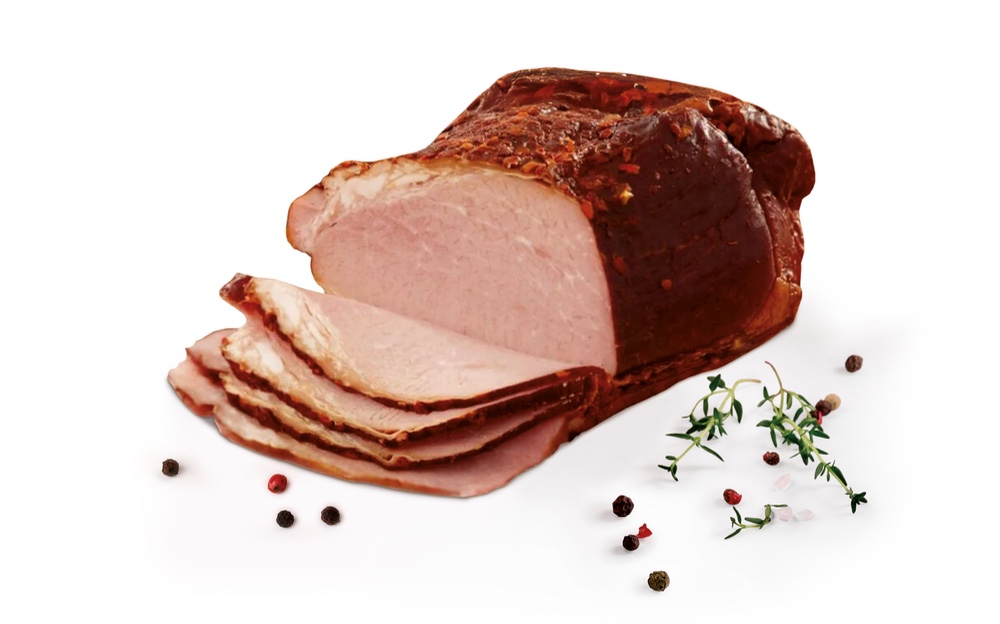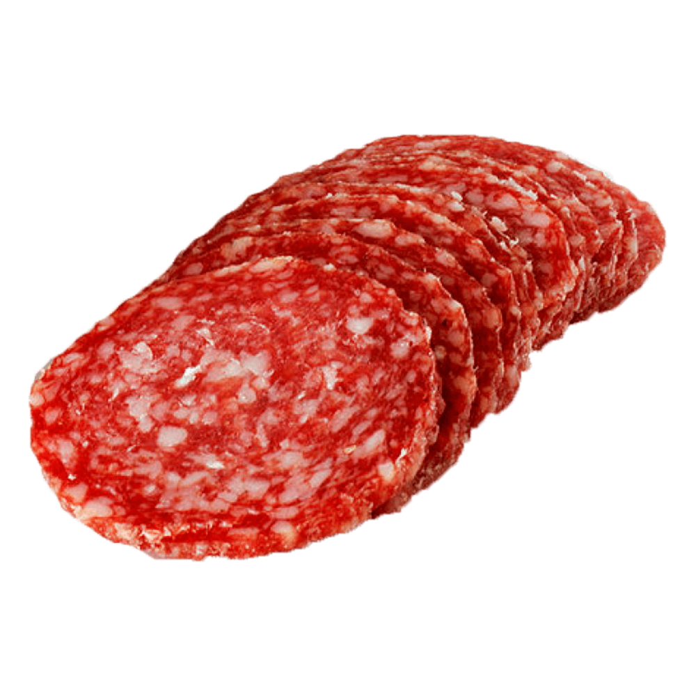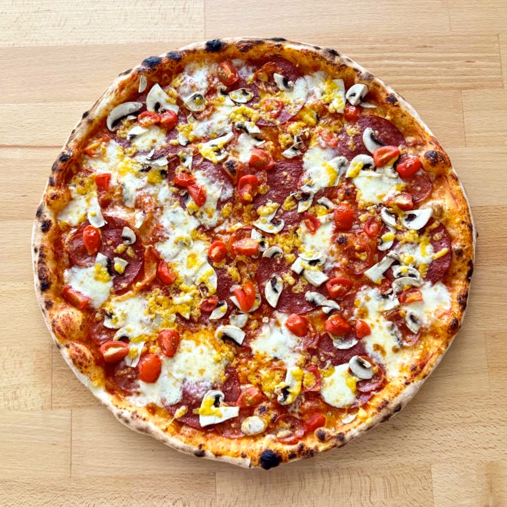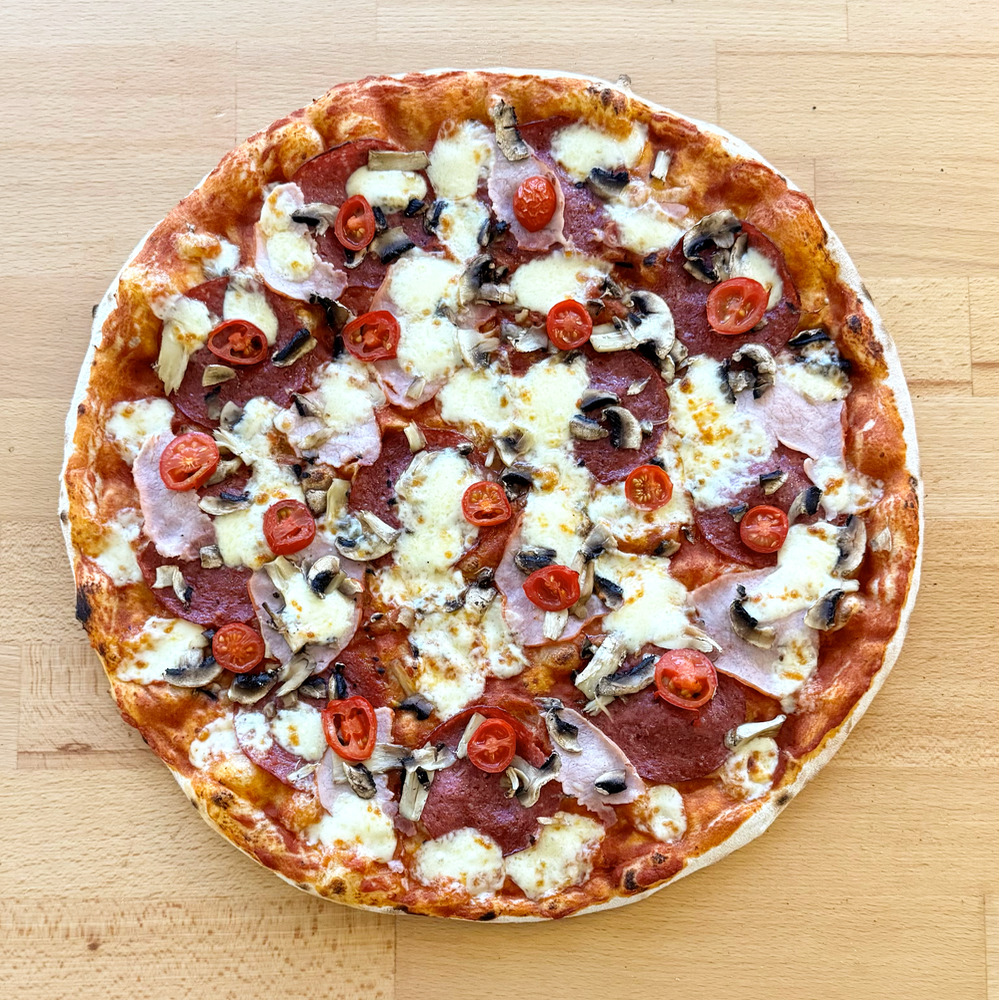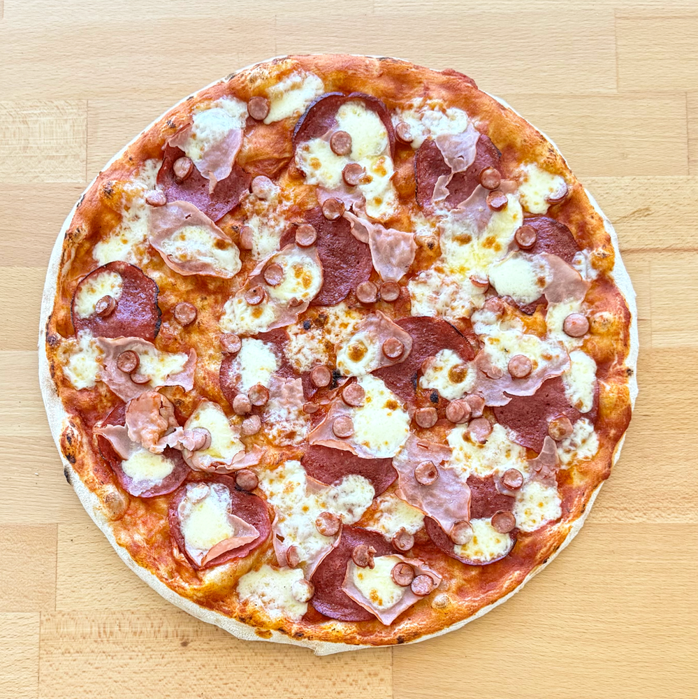Дууже мʼясна піца, у складі: ферментоване тісто, соус з томатів пелаті, моцарела, шинка, салямі, мисливські ковбаски, помідори, базилік