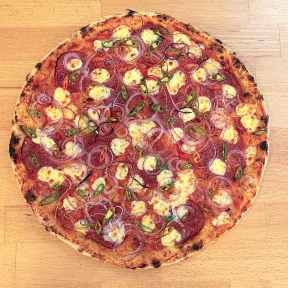 У складі: ферментоване тісто, соус з томатів пелаті, моцарела, салямі чорізо, гостра ковбаса пепероні, помідори, перець чилі, синя цибуля, базилік