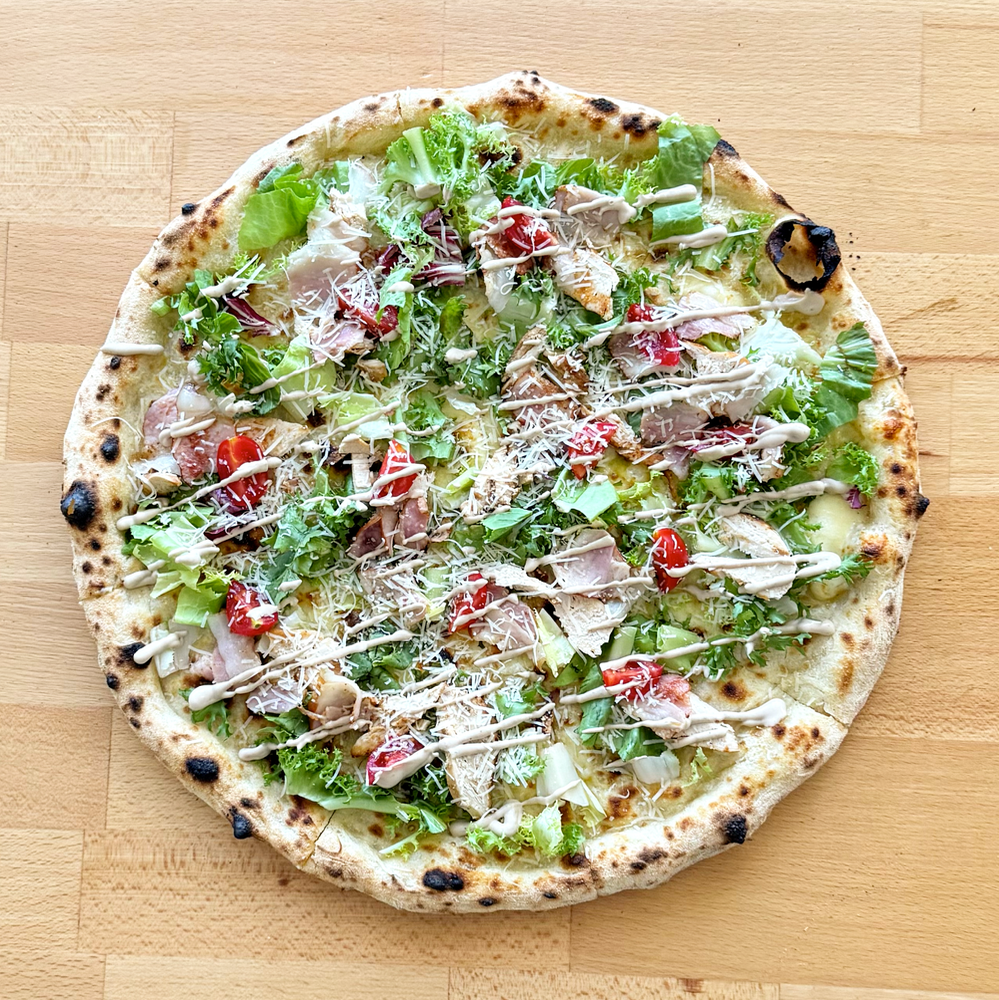 ферментоване тісто, соус вершковий, моцарела, куряче філе, бекон, листя мікс, помідори, соус цезар, пармезан