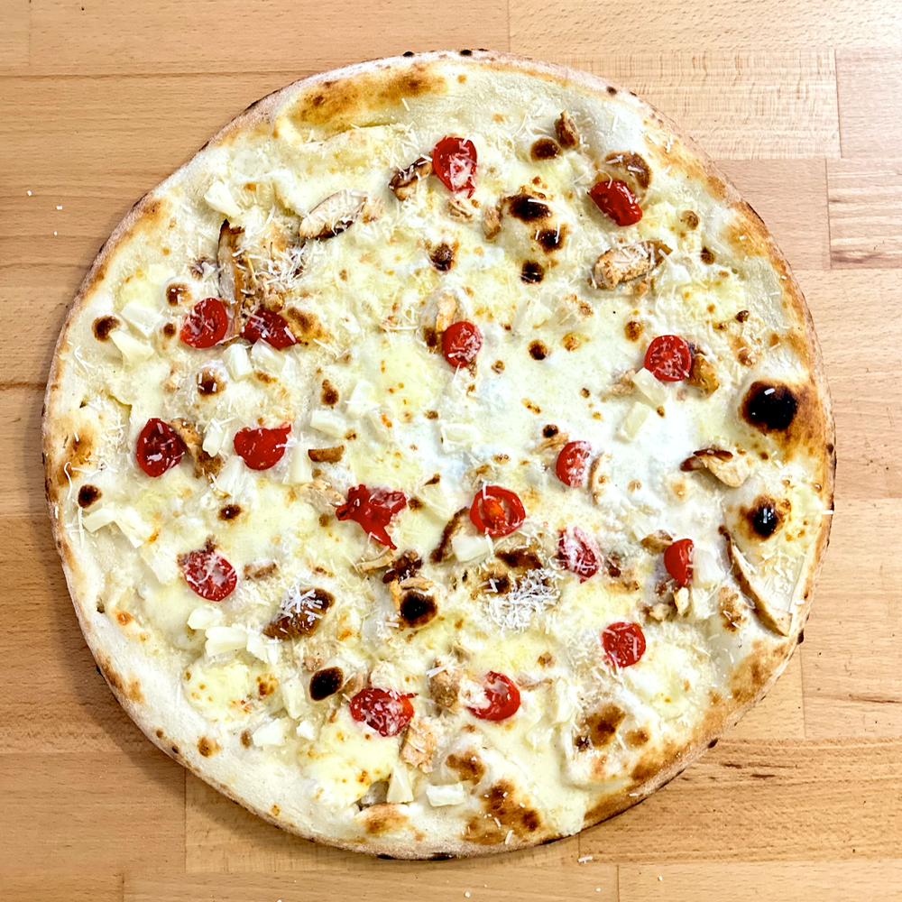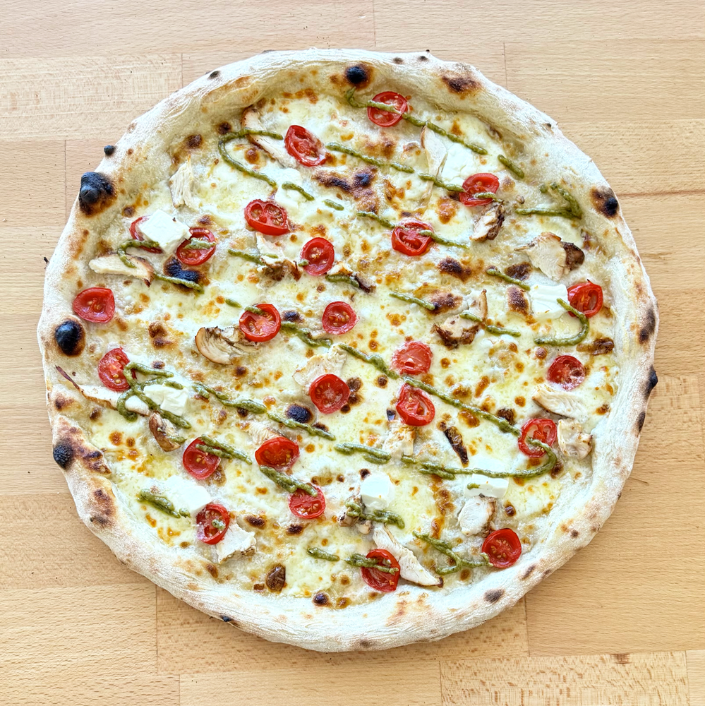 ферментоване тісто, соус вершковий, моцарела, куряче філе,часник, помідори, соус песто
