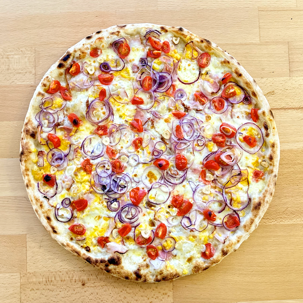 ферментоване тісто, вершковий соус , моцарела, сир чедр, бекон, часник, цибуляч синя, помідори